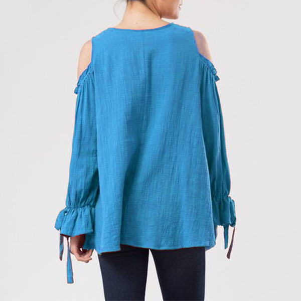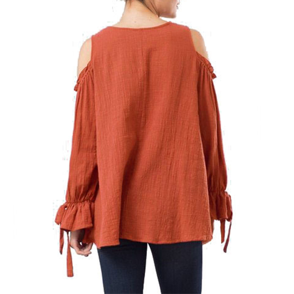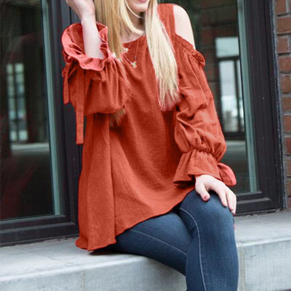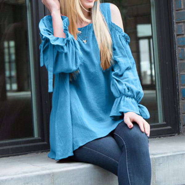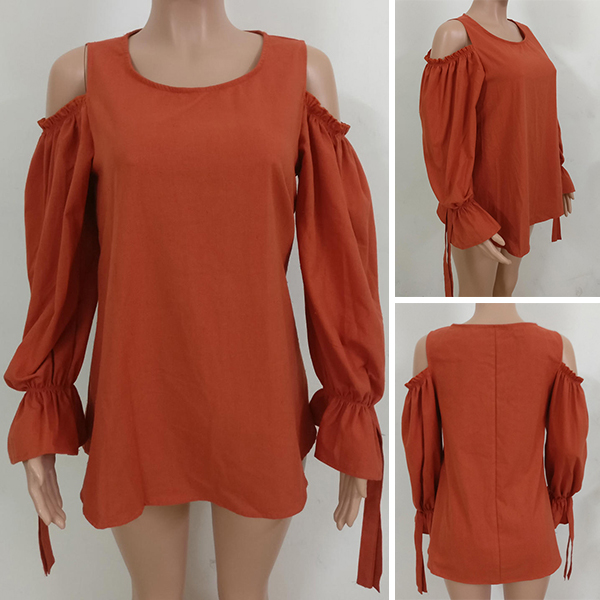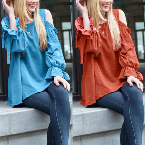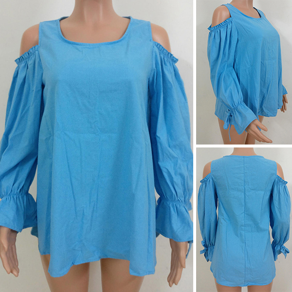 For a girlish style and sweet look? We suggest you choosing this piece. Solid color style,the off-shoulder and trumpet sleeve