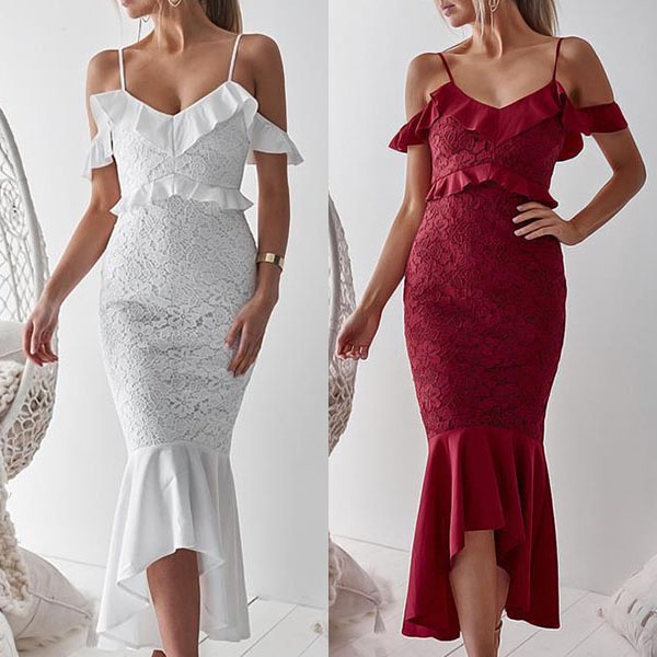 details like off-shoulder,v-neck,fishtail hem and lace spliced design make this piece look so sexy and sultry.