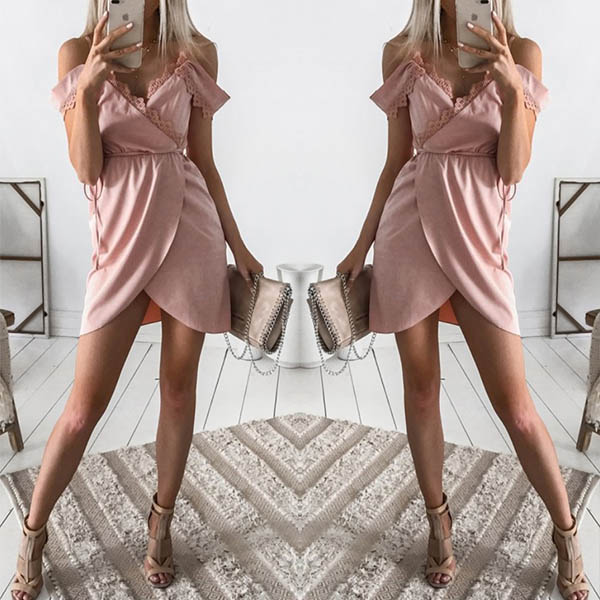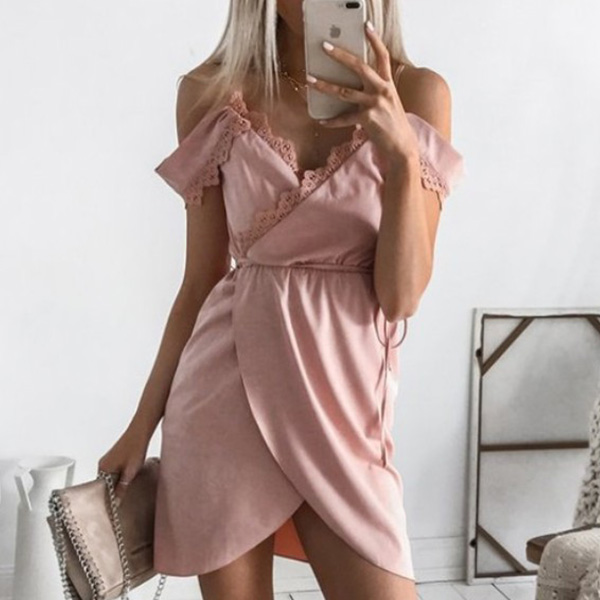 This sling dress comes with a sweet pink tone,the off-shoulder,v-neck,irregular hem and lace spliced design will