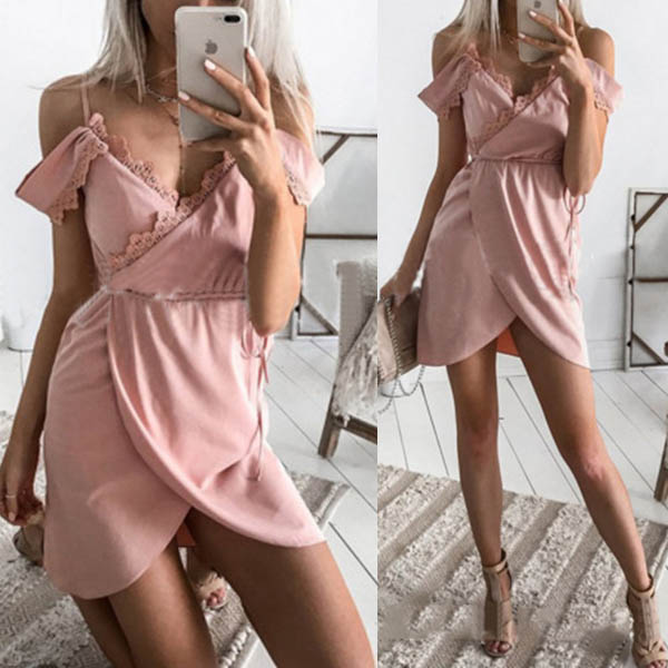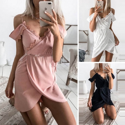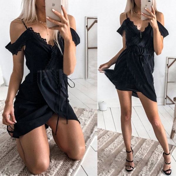 designed with off-shoulder,v-neck,irregular hem and lace spliced design,this alluring dress of course