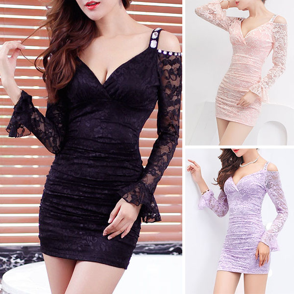 It is a good choice to invite this delicate lace dress to your wardrobe ensemble! The off-shoulder and v-neck