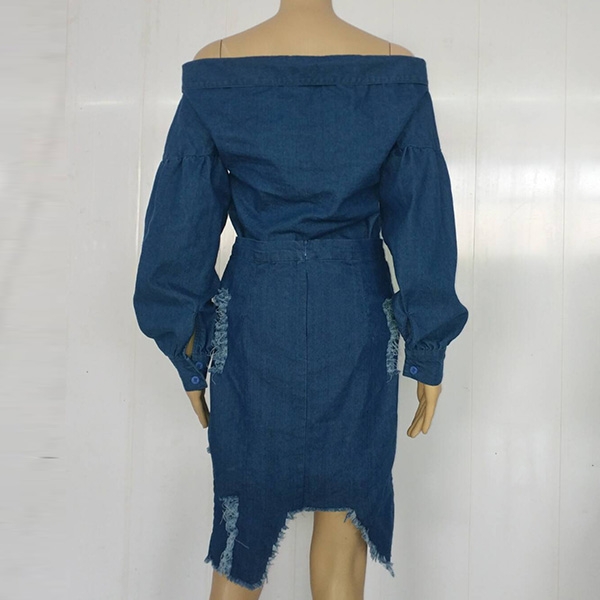 denim fabric with laid-back style, featuring an off-the-shoulder top with button front design, lantern sleeve