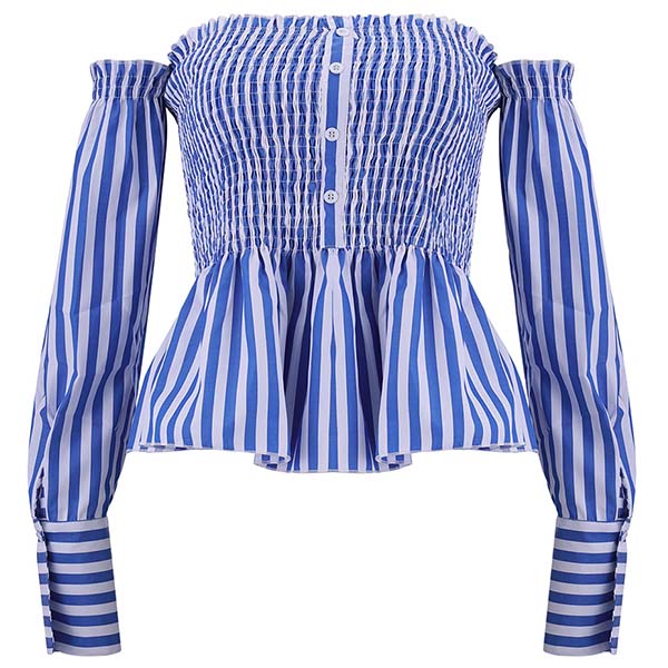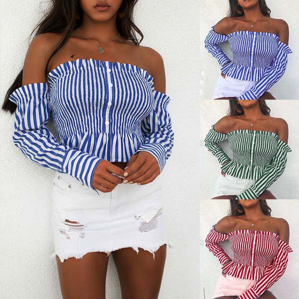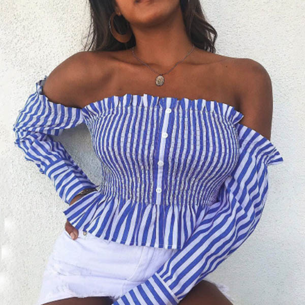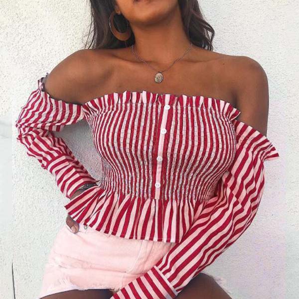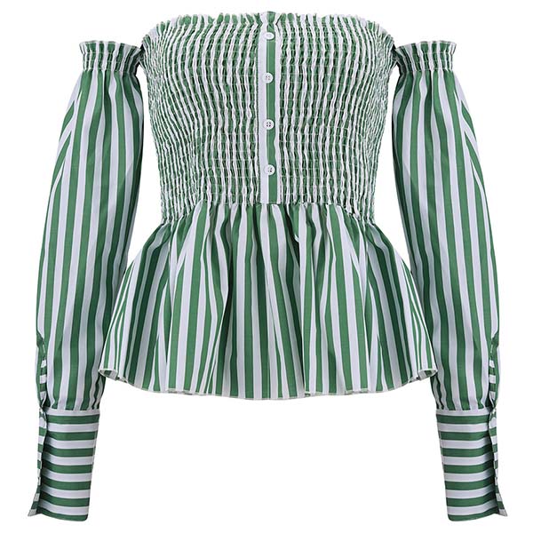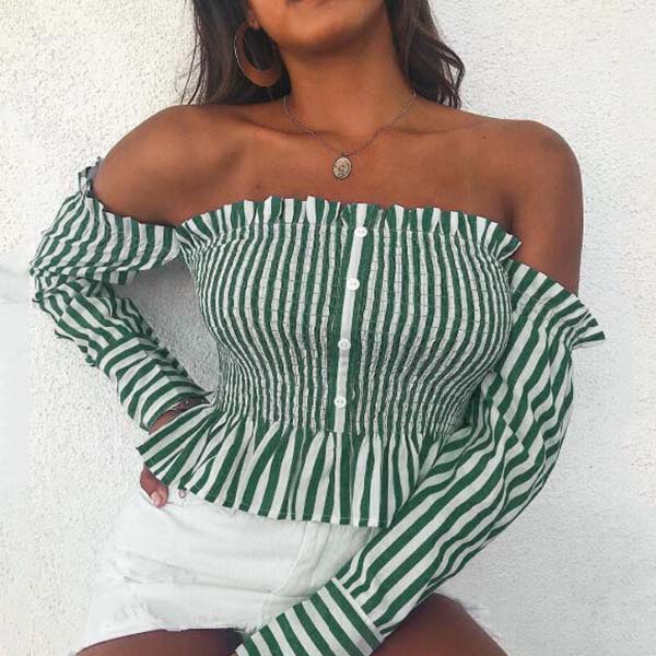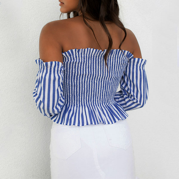and stretchy fabric, featuring with an allover stripe print, a ruffled off-the-shoulder neckline, a long sleeve,
