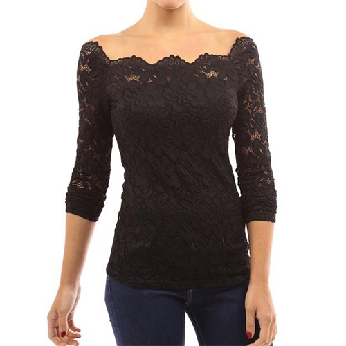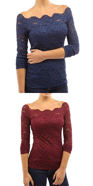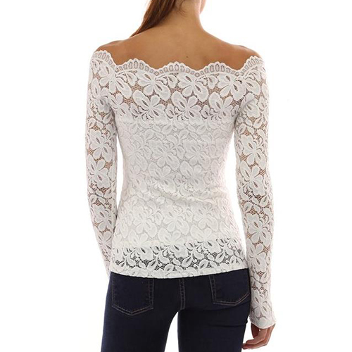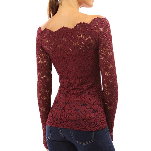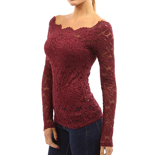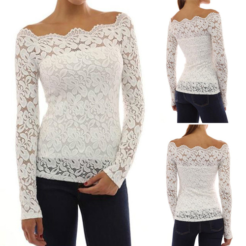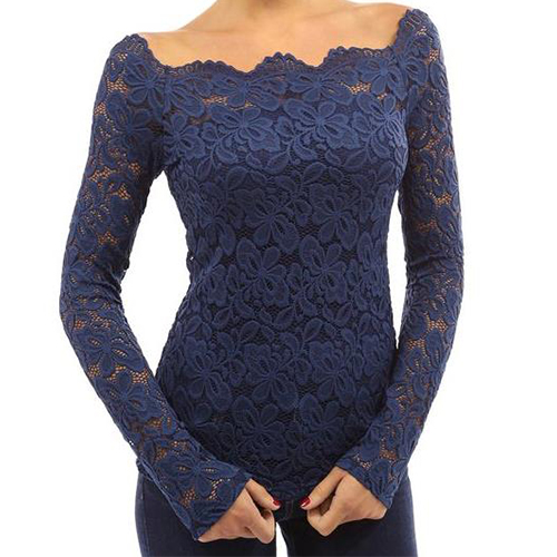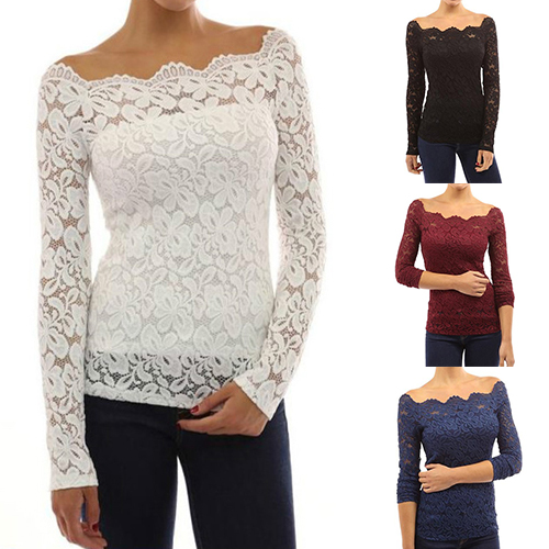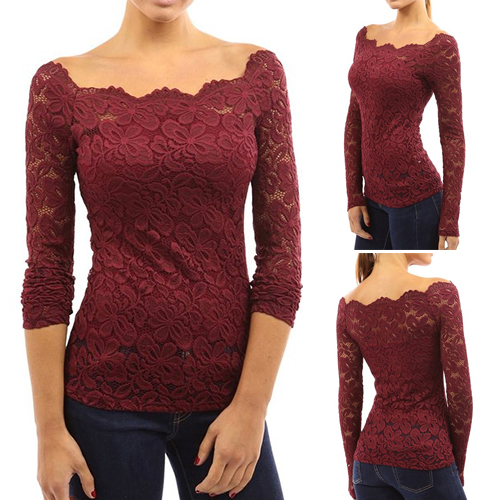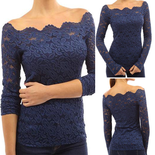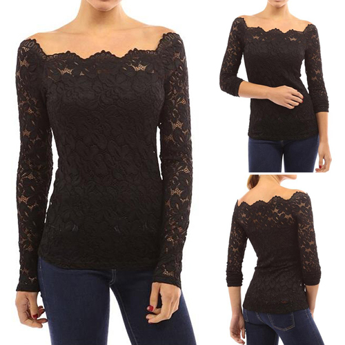 This top is designed with an off-the-shoulder collar and long sleeves. What's more, this top is solid color while it is also lace spliced, which makes it look quite sexy and fashion. Remember to choose your favorite color among the four colors that we provide to you before you place your order.