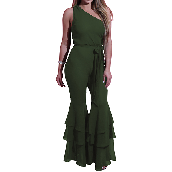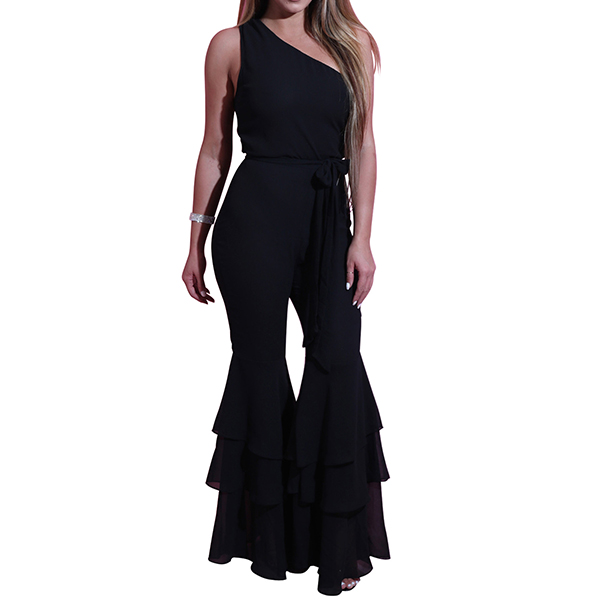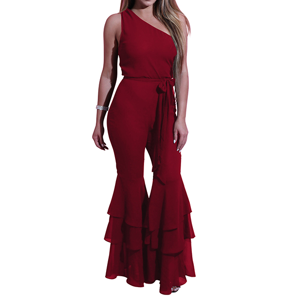 Sexy One-shoulder High Waist Solid Color Flared Jumpsuit