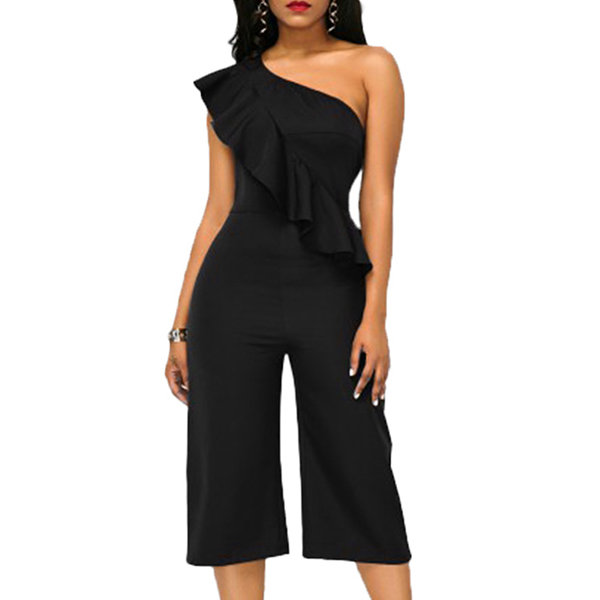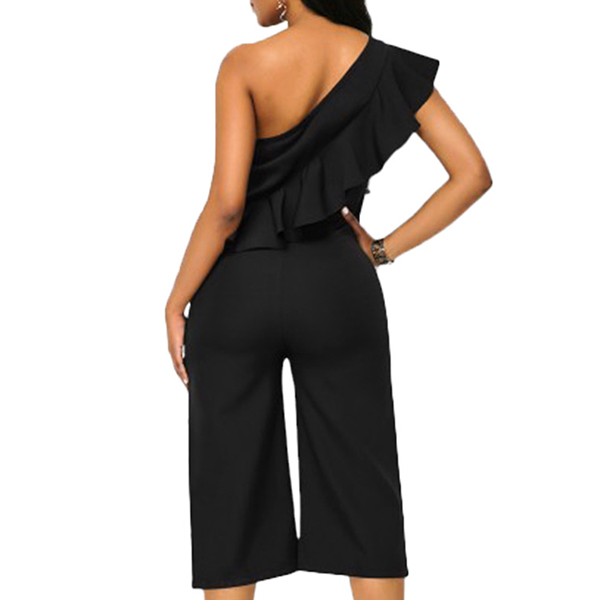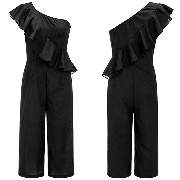 and flattering black tone,accompanied with one-shoulder and ruffle details,which make this piece look more alluring.
