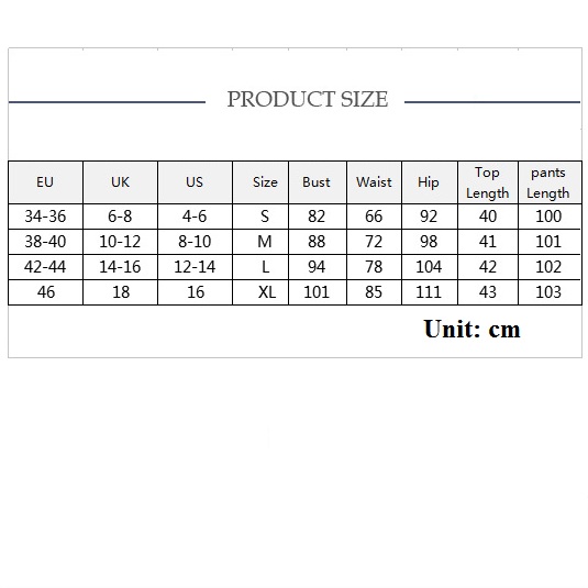 XL : Bust : 101cm(39.76"); Waist : 85cm(33.46"); Hips : 111cm(43.7"); Top Length : 43cm(16.93"); Pants Length : 103cm(40.55");