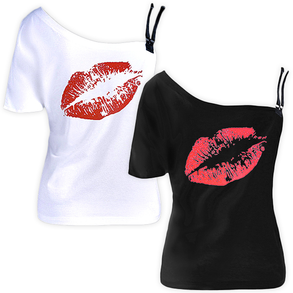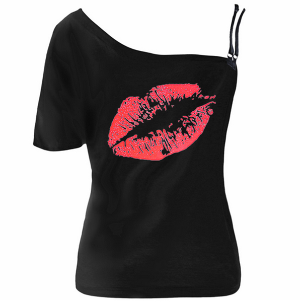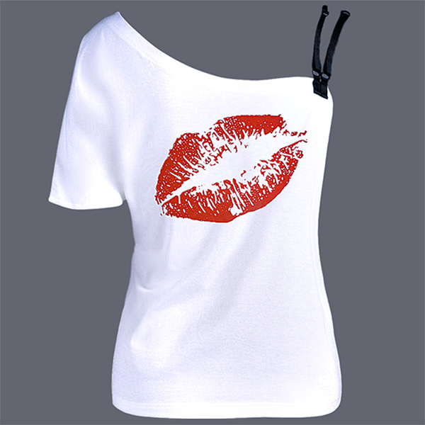 Slip into this t-shirt for a simple,cozy yet feminine style. One-shoulder style,with red-lip printed pattern design makes it look