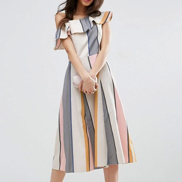 Exude a sense of elegant femininity by donning this dreamy dress. Striped style,its one-shoulder and ruffle design