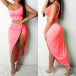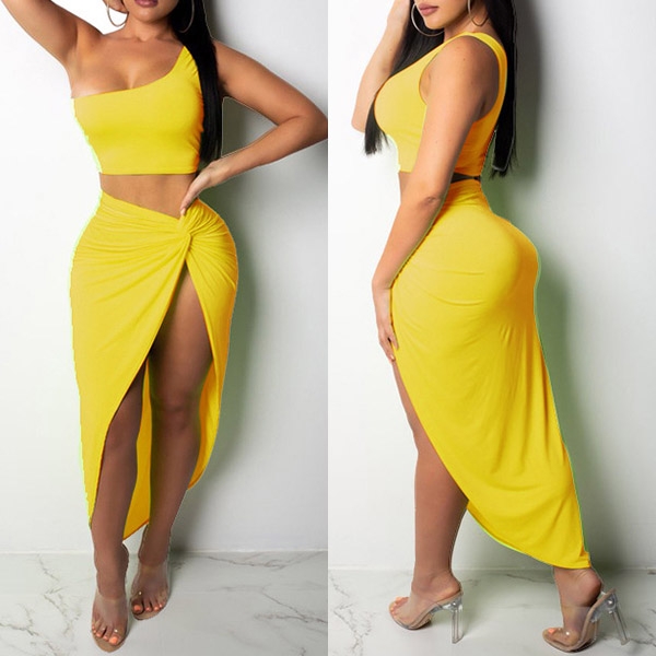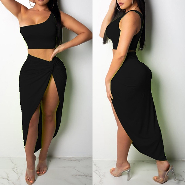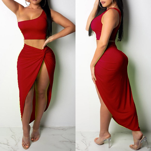 sleeveless crop top and a high waist slit hem skirt,this two-piece set can easily showcase your sexy and alluring side.