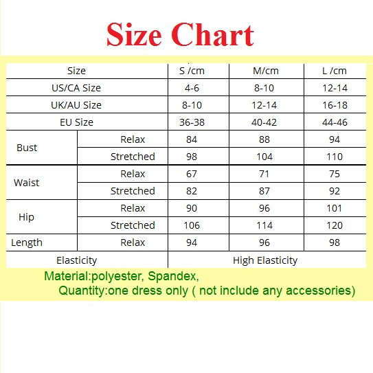 XL : Bust : 98cm - 116cm(38.58" - 45.67"); Waist : 79cm - 97cm(31.1" - 38.19"); Hips : 106cm - 126cm(41.73" - 49.61"); Length : 100cm(39.37");