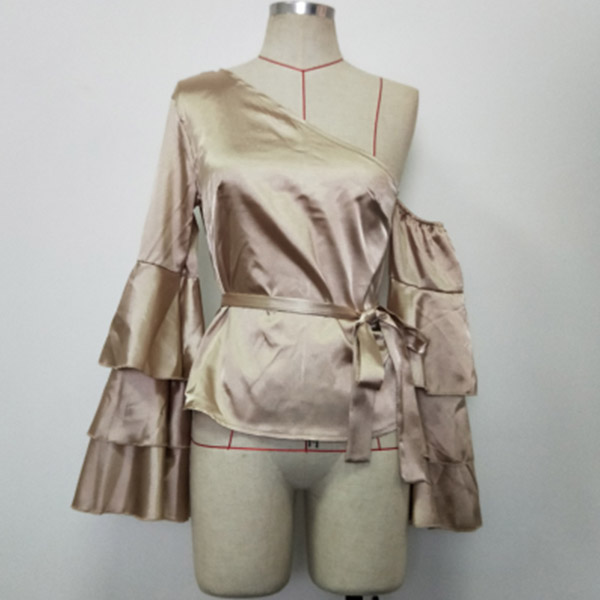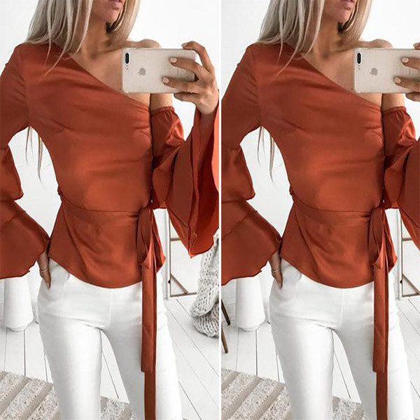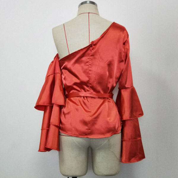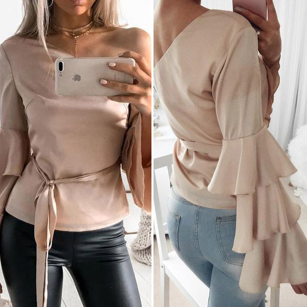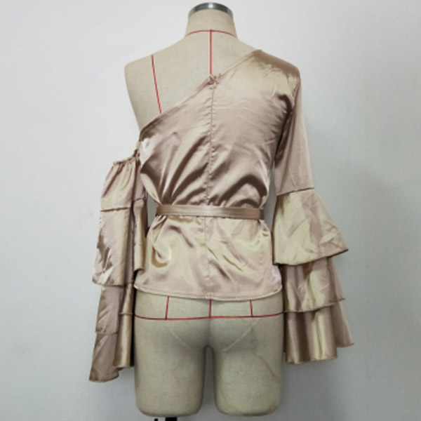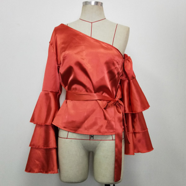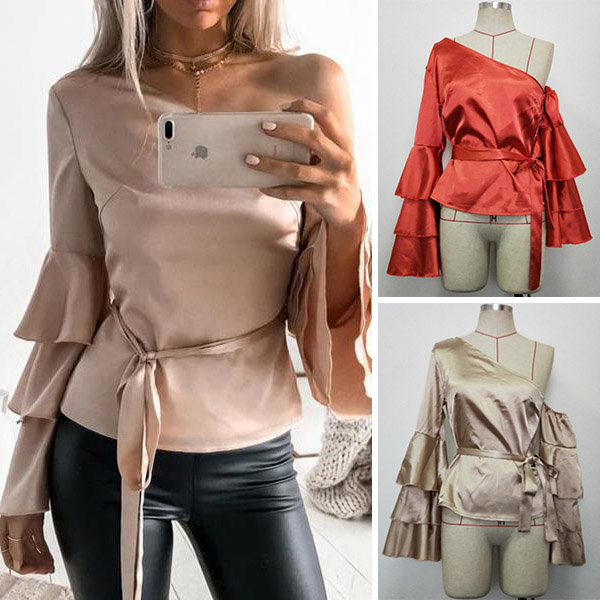 the one-shoulder and trumpet sleeve design make this piece look more appealing. Waist part with lace-up design