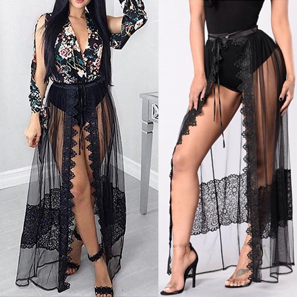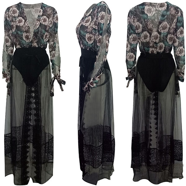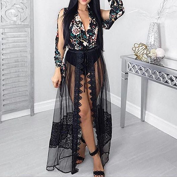 If you wanna win more eyes,you can opt for this two-piece set. Consists of a printed chiffon spliced bodysuit and a see-through