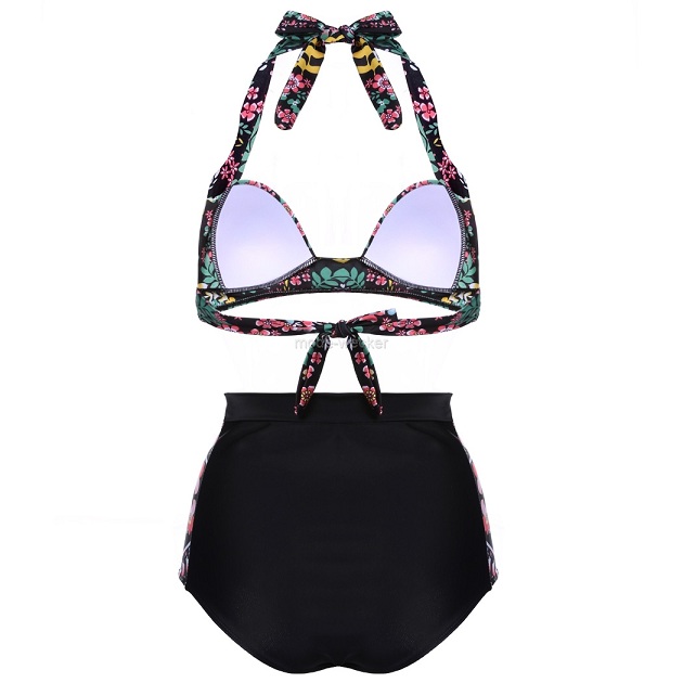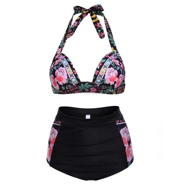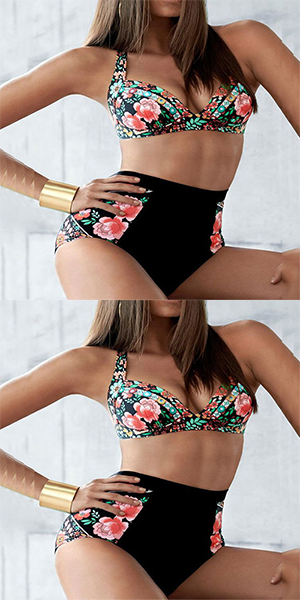 Featuring chic floral print, this bikini set includes a halter tops and a high waist briefs, sexy and fashion.