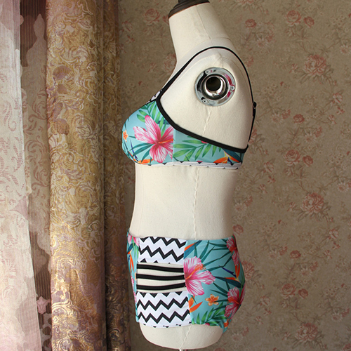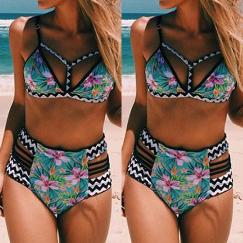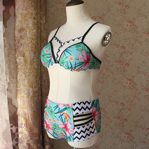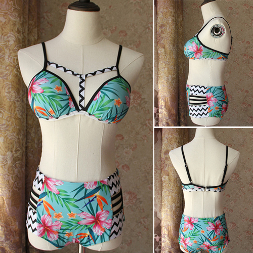 Features chic and sweet floral print,including a bikini top and a high waist briefs,with hollow out