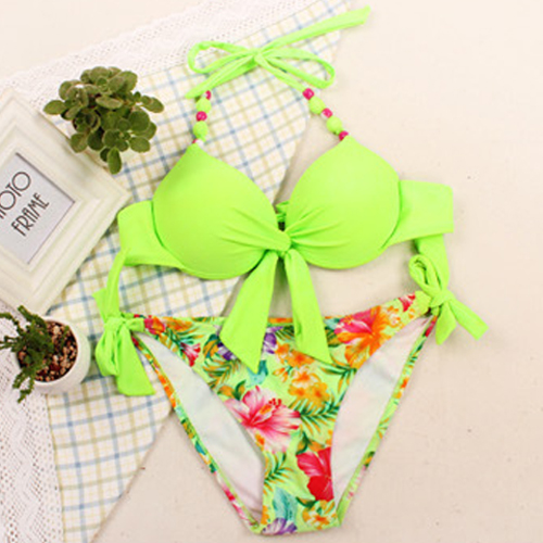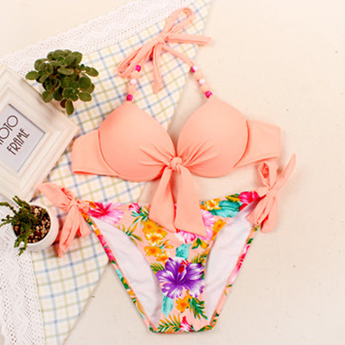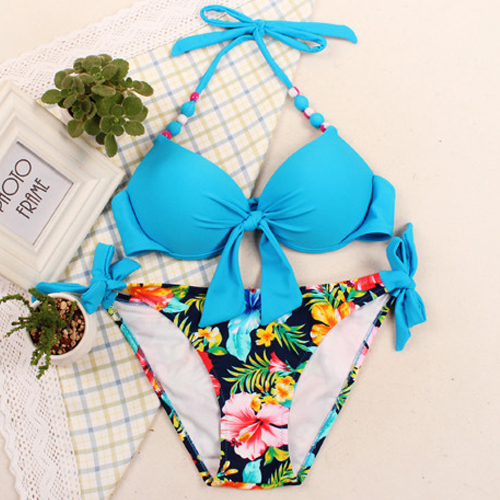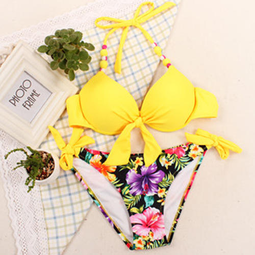 bikini set. Including a halter bra and a floral print briefs,this bikini set will make you be the focus on the beach.