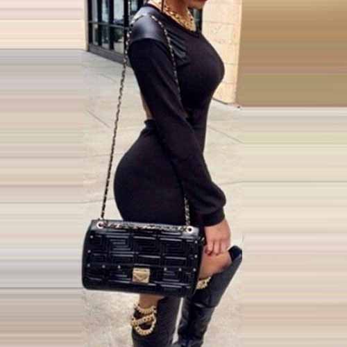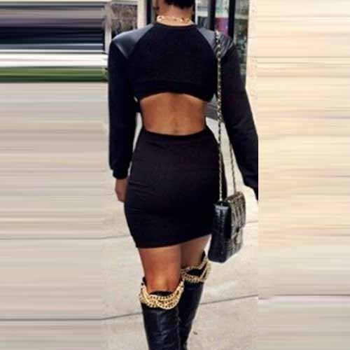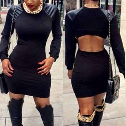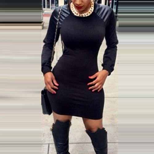 PU leather spliced style,with long sleeve,round neck and a fit silhouette,this sheath dress