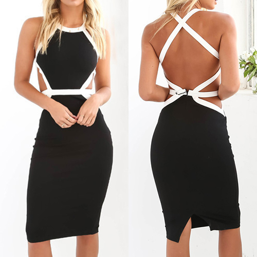 The collocation of white and blacks make this dress very eye-catching. With round neck, sleeveless,