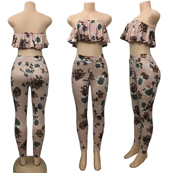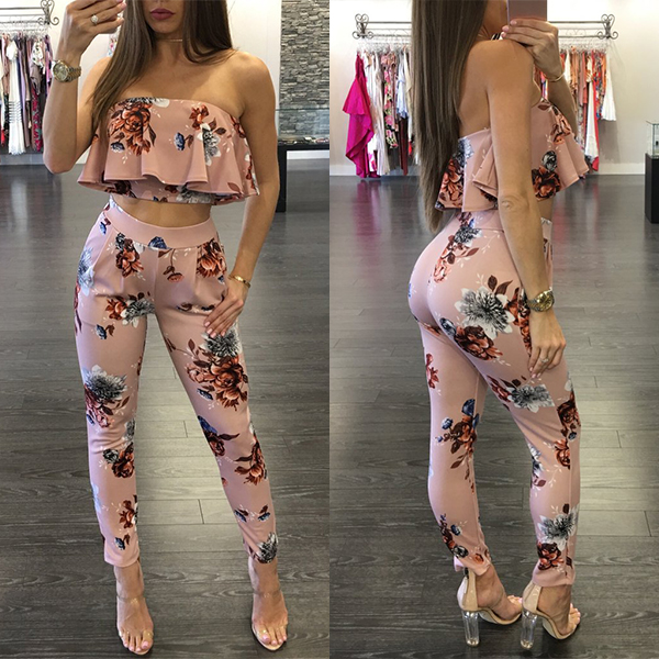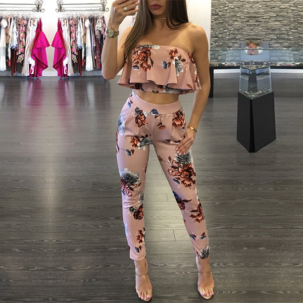 Boasts sweet and vibrant floral print,including a ruffle bandeau top and a high waist pants,this two-piece set can give you a