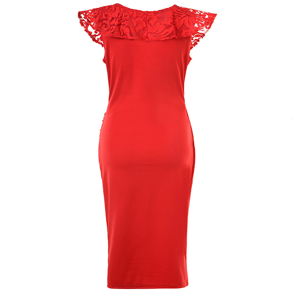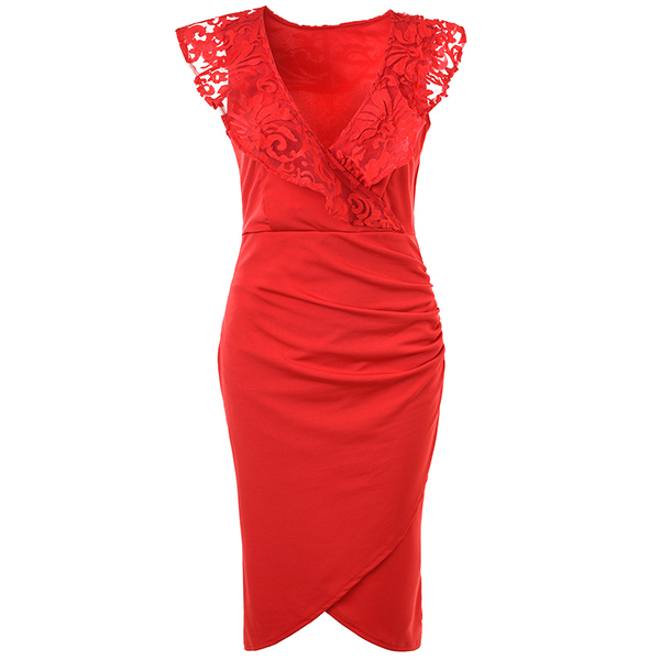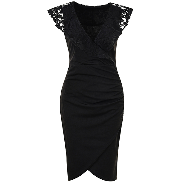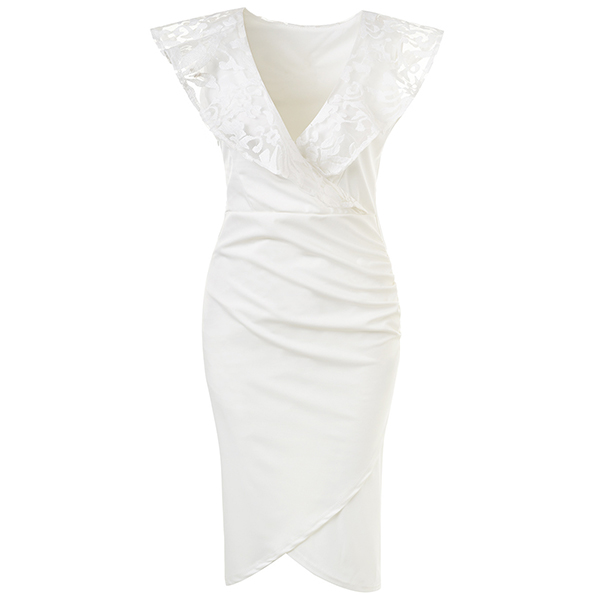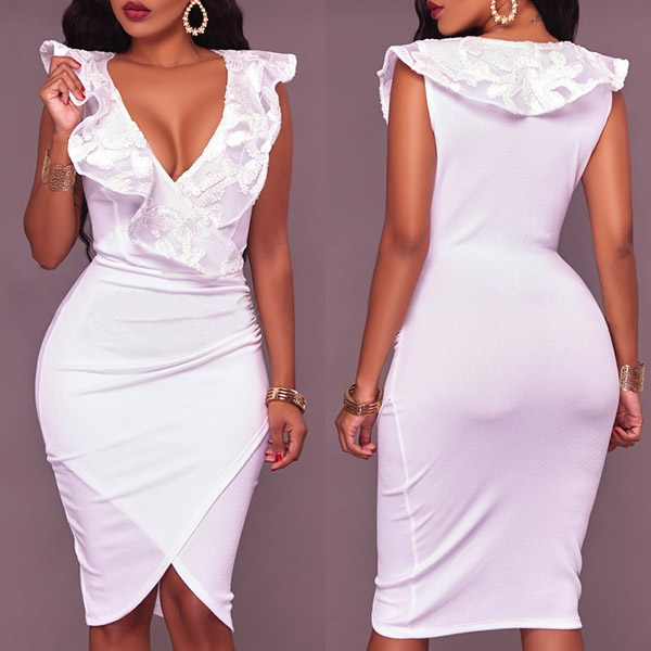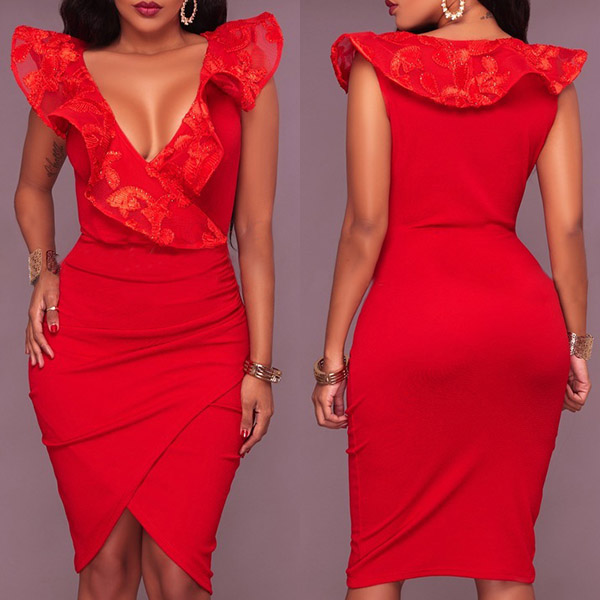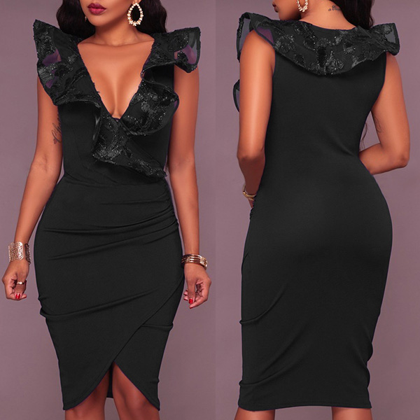 Solid color tone design can give you an elegant vibe,while the ruffle deep v-neck and and tight silhouette