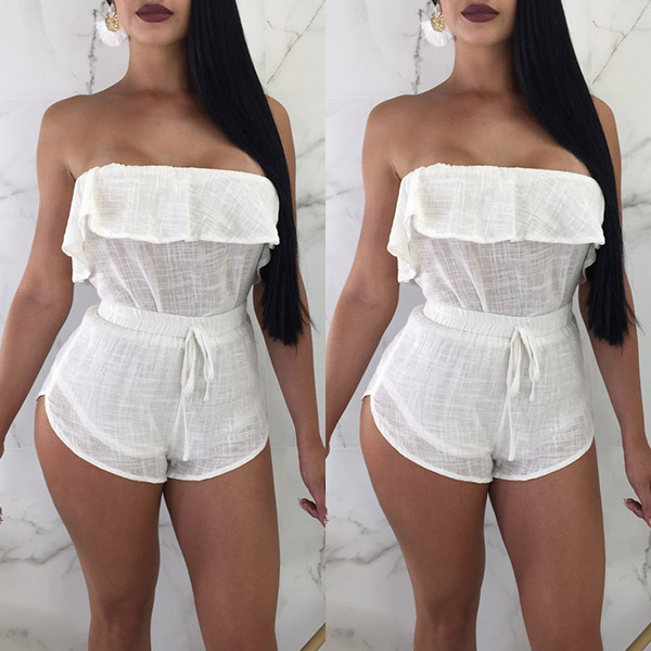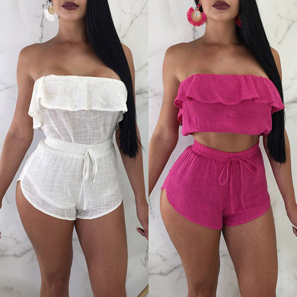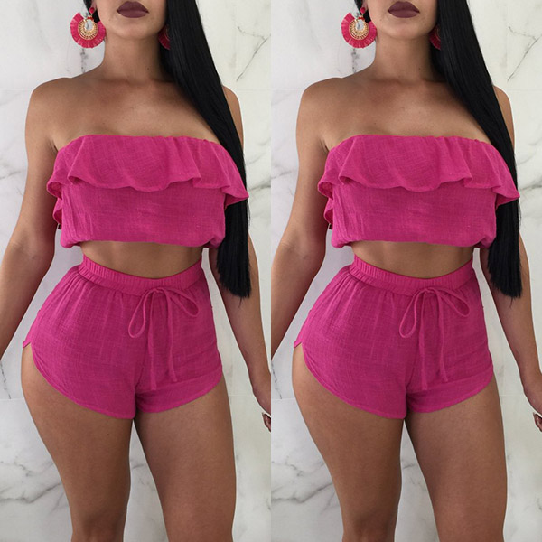 Consists of a ruffle strapless top and a shorts,this two-piece set knows how to express your sexy and charming side.