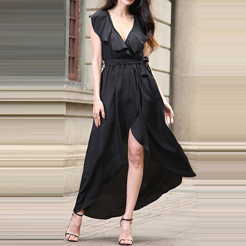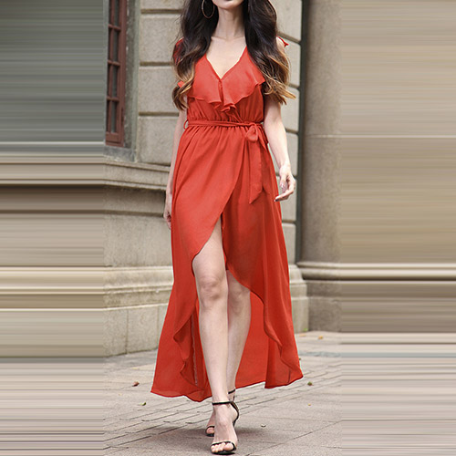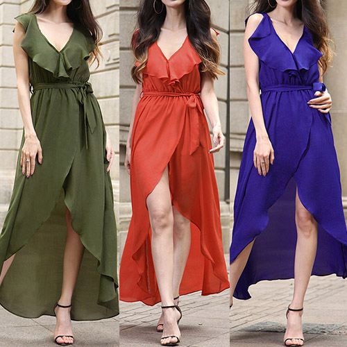 chiffon maxi dress is your best choice. Solid color style,with sleeveless,v-neckline,an irregular hem and