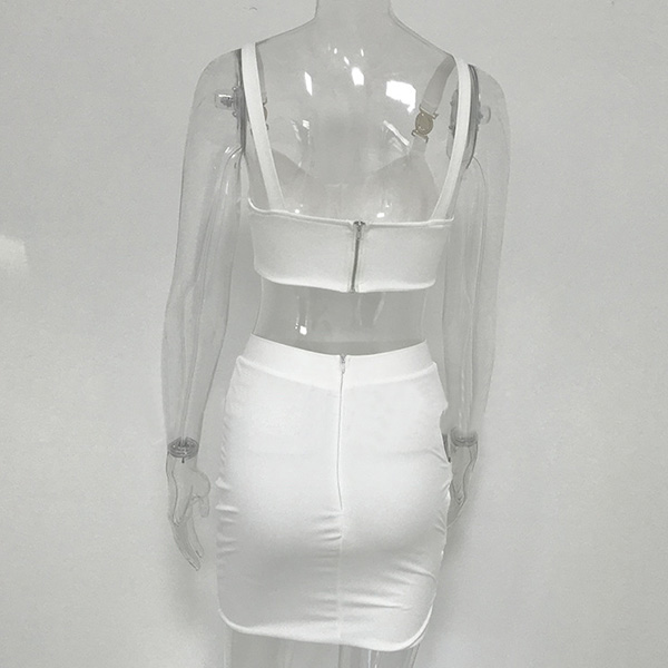 scoop neckline, metal buckle detail on the cami strap, backless, a back zipper, as well as a fitted skirt,