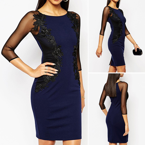 this sheath dress. Its sultry details such as see-through gauze and lace spliced design make this piece look