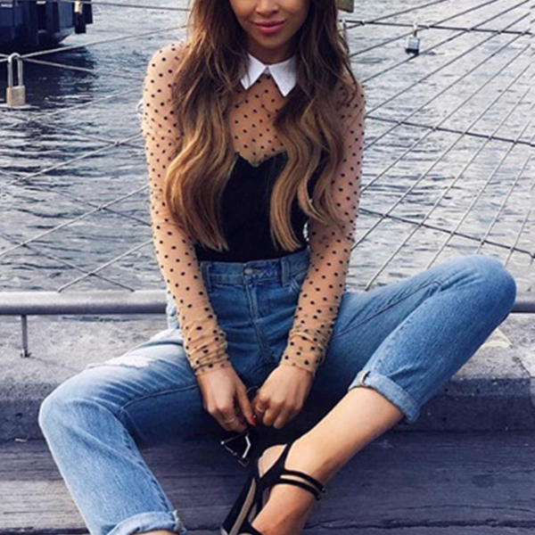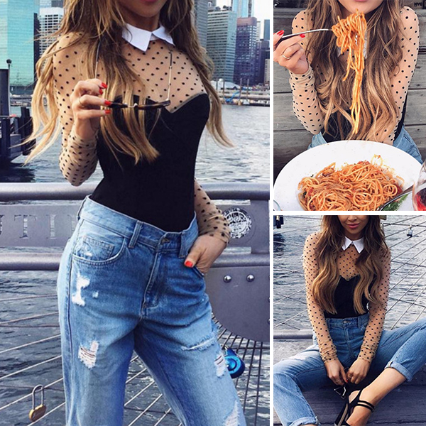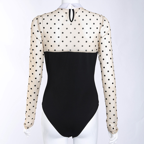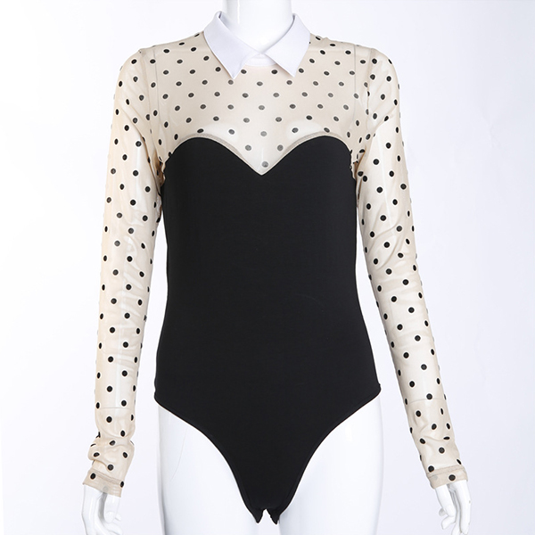 Exude the allure of an elegant lady when you slip into this long sleeve bodysuit. See-through gauze spliced design