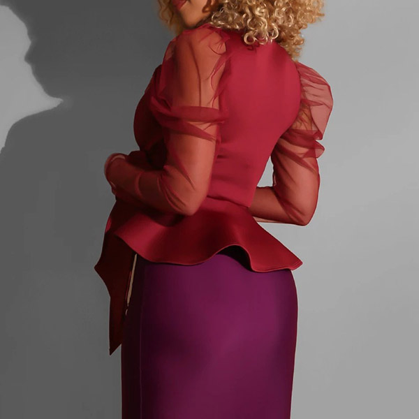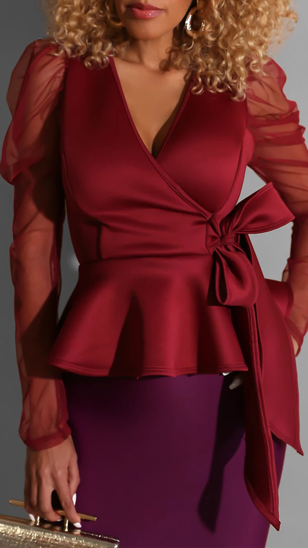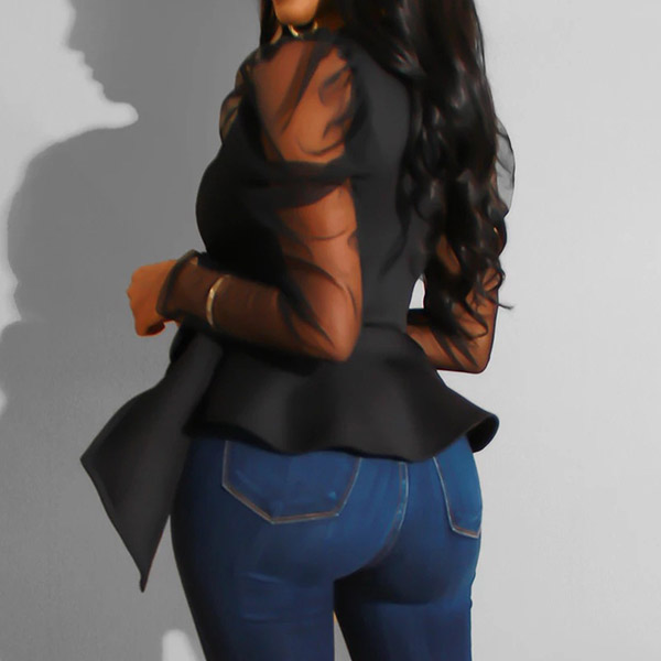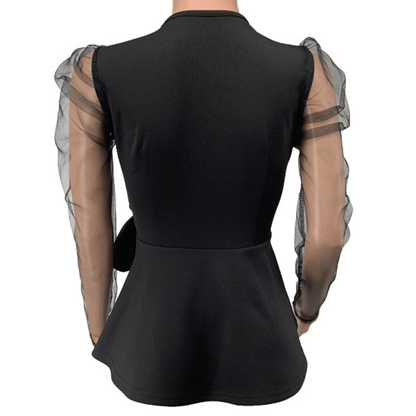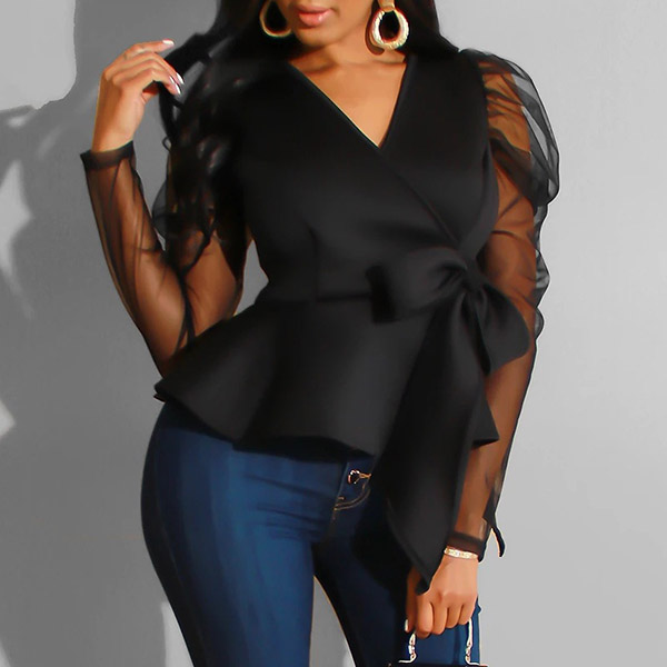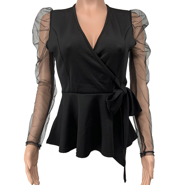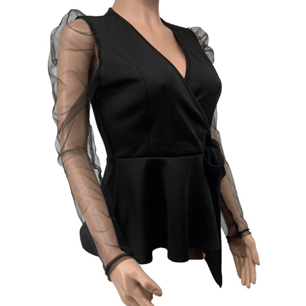 the deep v-neck and see-through gauze spliced long sleeve design will make this piece look more