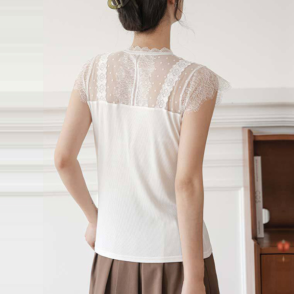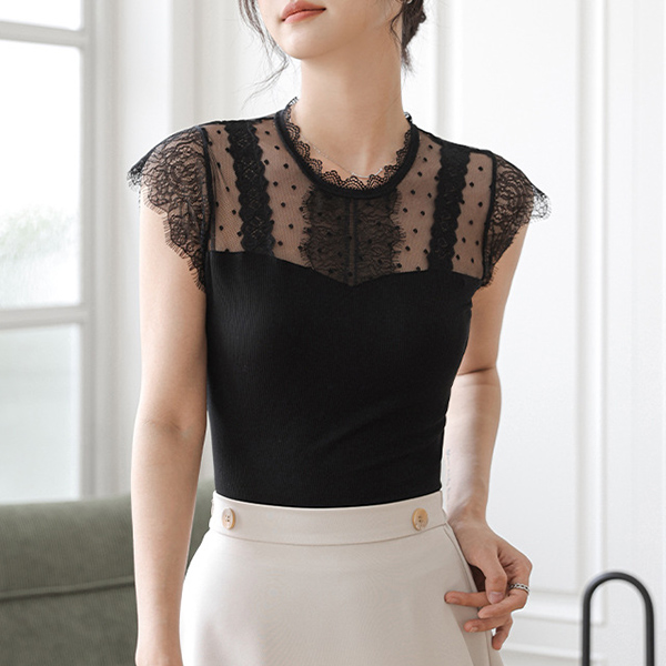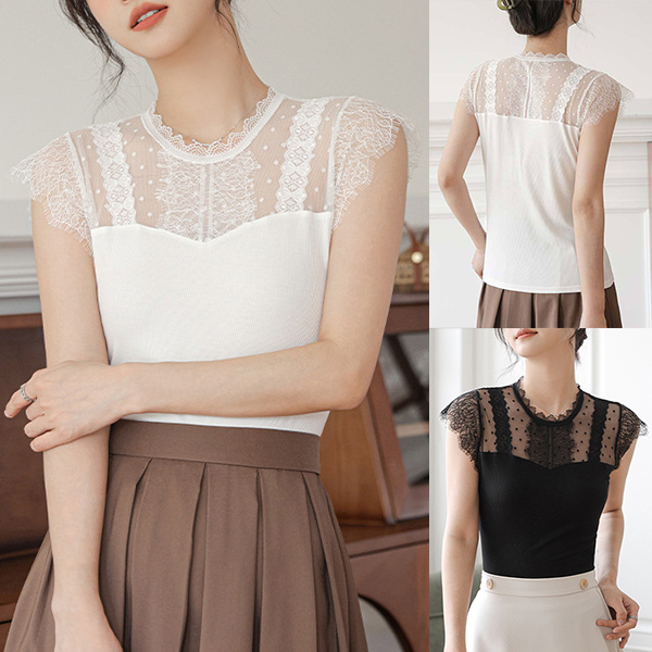 Sexy See-through Lace Spliced Sleeveless Round Neck T-shirt