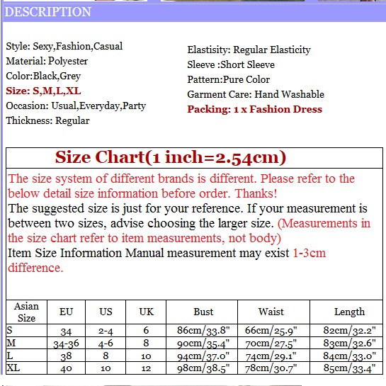 XL : Bust : 98cm(38.58"); Waist : 78cm(30.71"); Length : 85cm(33.46");