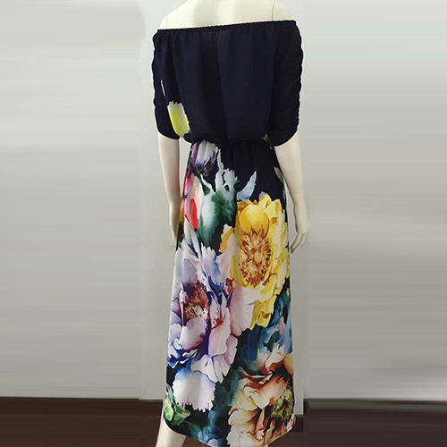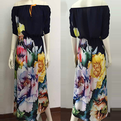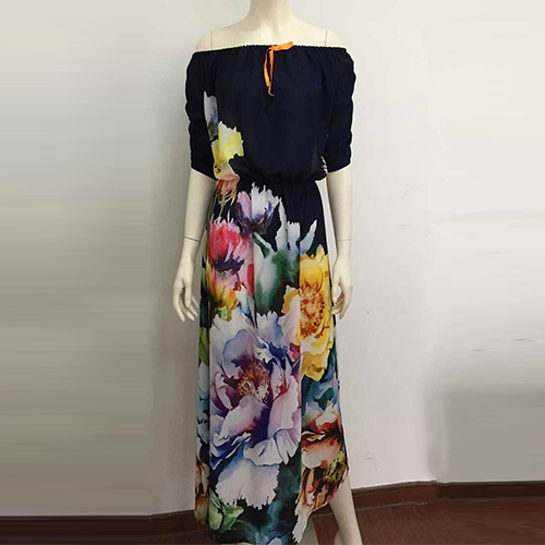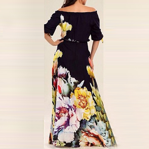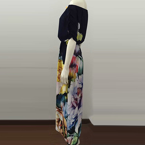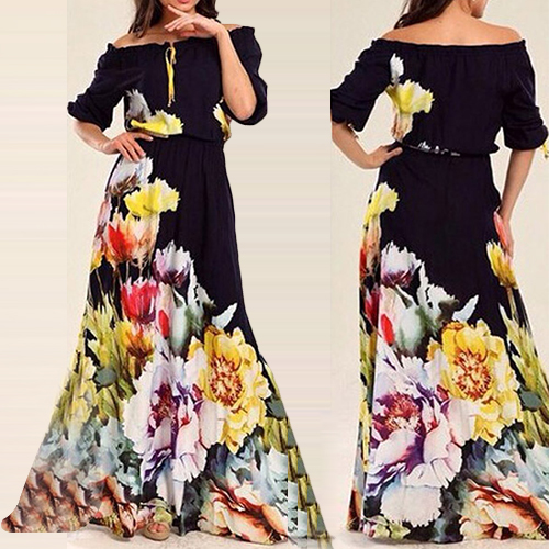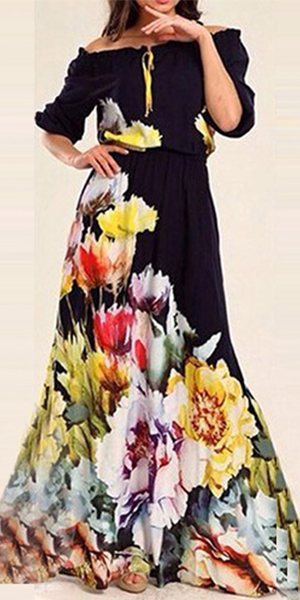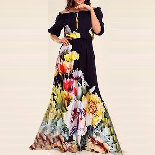 Boasting a vibrant and eye-catching floral print,with slash neck,half sleeve and a maxi length,this dress