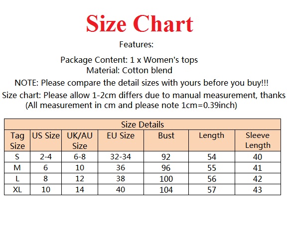 XL : Bust : 104cm(40.94"); Sleeve : 43cm(16.93"); Length : 57cm(22.44");