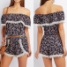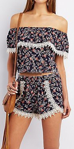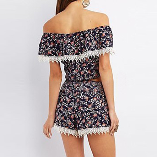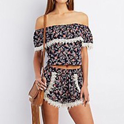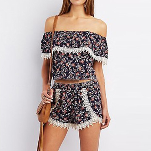 Sexy Slash Neck Lace Spliced Crop Tops + High Waist Shorts Printed Two-piece Set