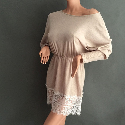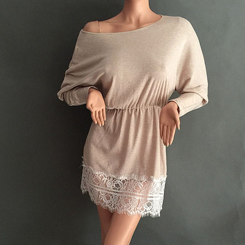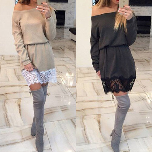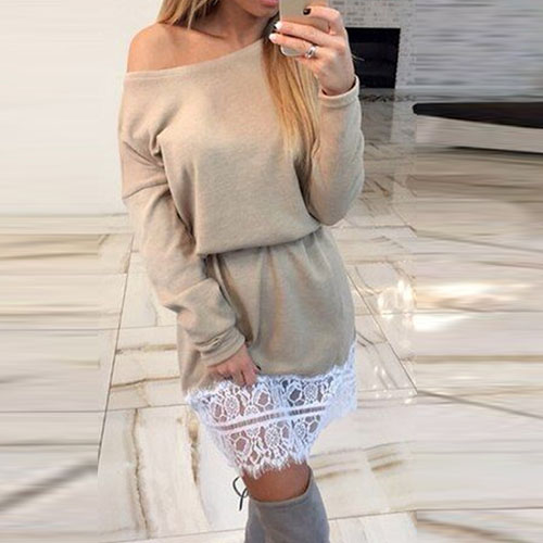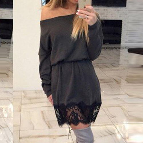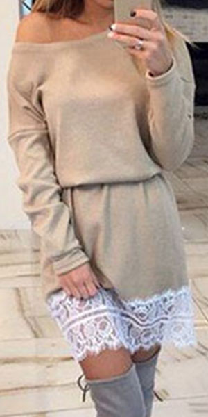 Sexy and feminine,this dress features a slash neck and lace spliced design,chic and charming.