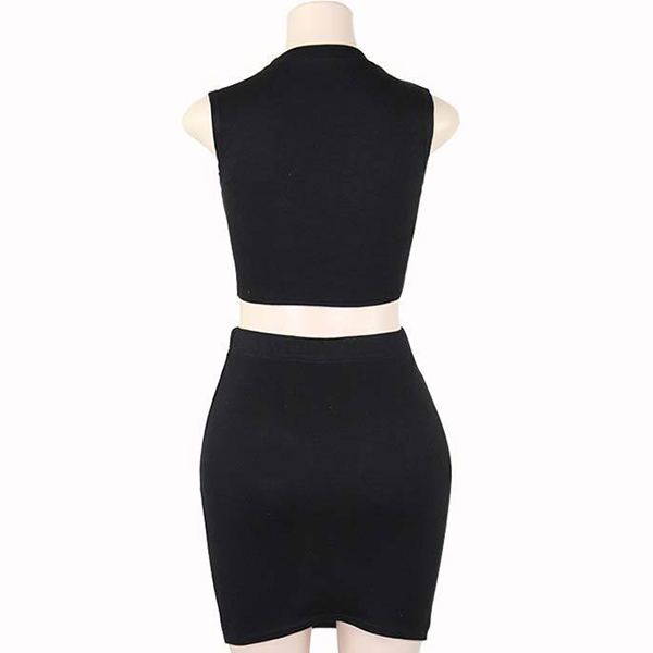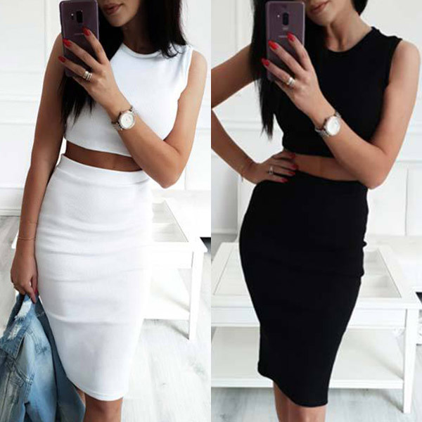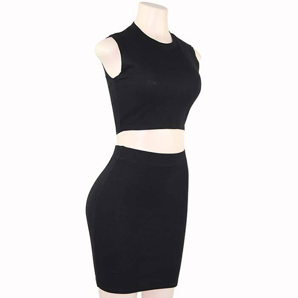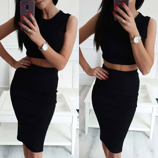 no longer be a secret. Solid color style,including a sleeveless round neck crop top and a high waist skirt,