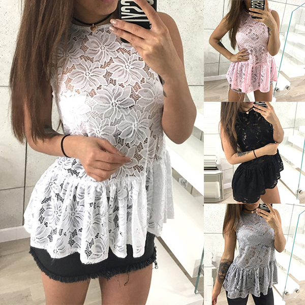 Hollow out lace style,designed with sleeveless,round neck and ruffle hem,this top can perfect portray your female charm.