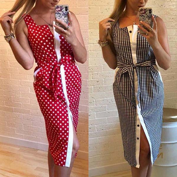 Boost your beautiful charms with the help of this sleeveless dress! Its slit hem and square collar