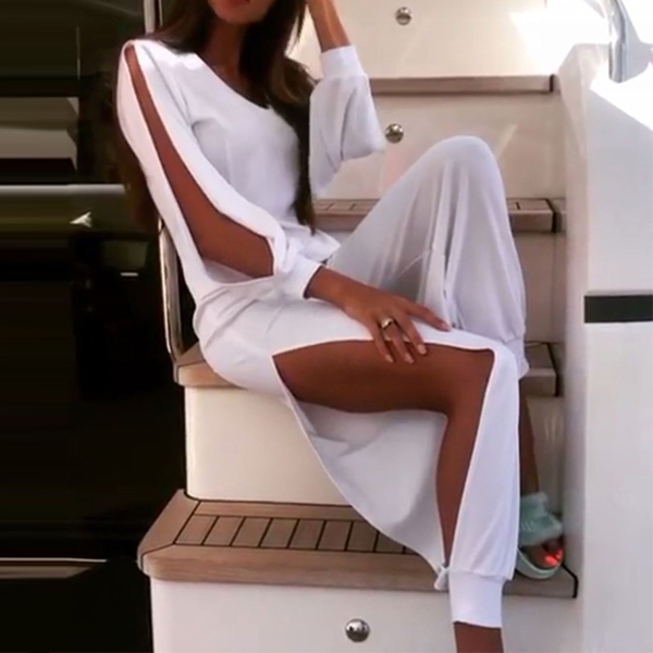 including a slit long sleeve v-neck top and a high waist slit pants,sexy and distinctive. When dressing yourself