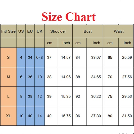 XL : Bust : 96cm(37.8"); Waist : 80cm(31.5"); Shoulder : 40cm(15.75");