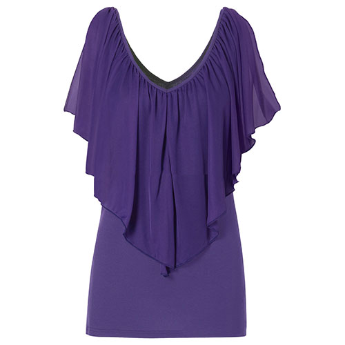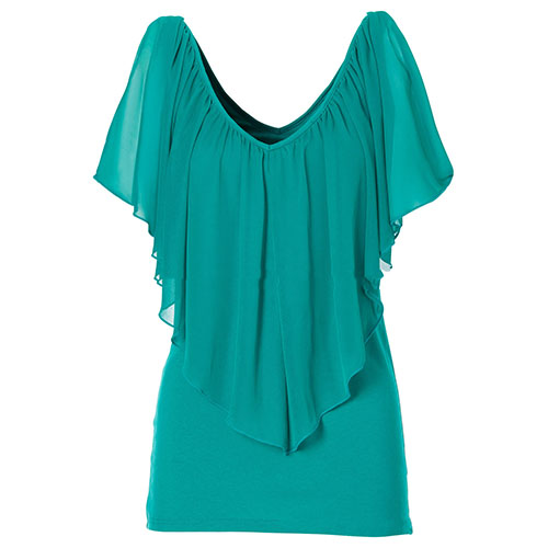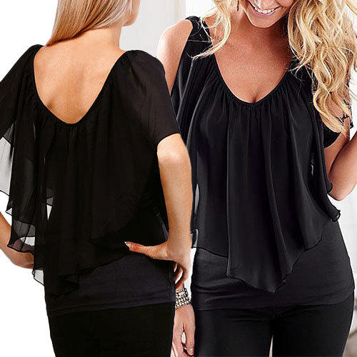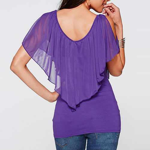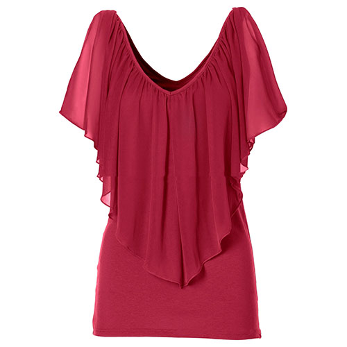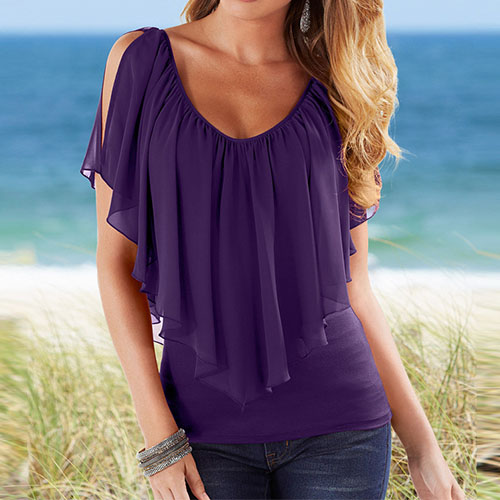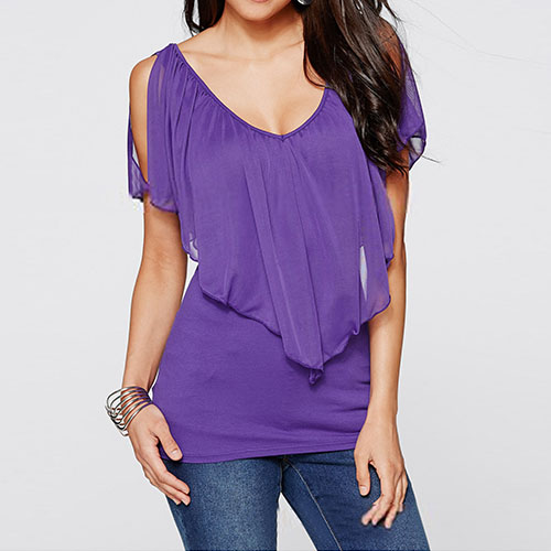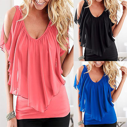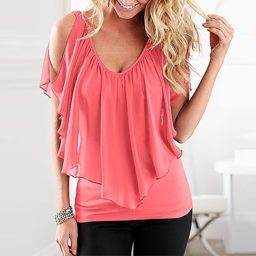 Boasting soft and flowy fabric, with solid color, v-neck, cold shoulder and chiffon spliced design,