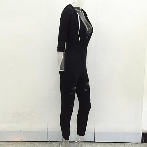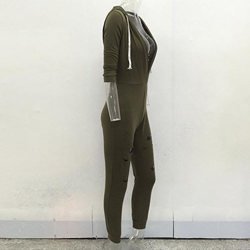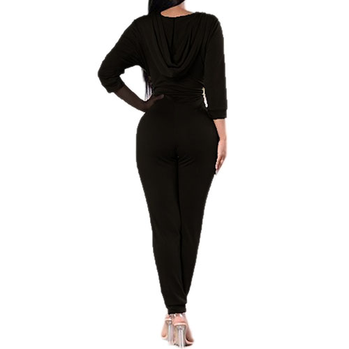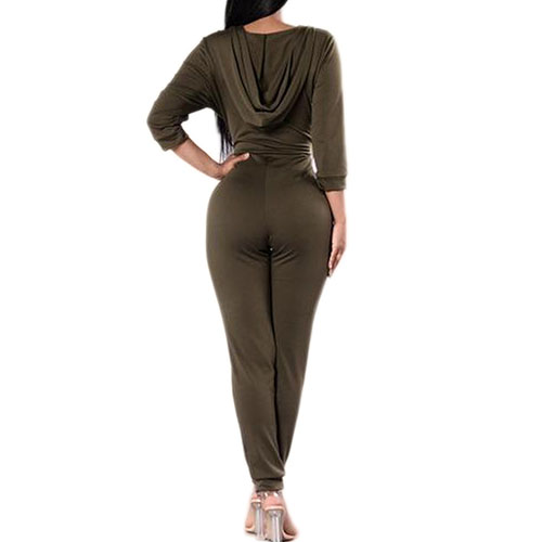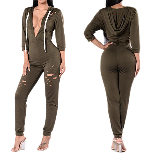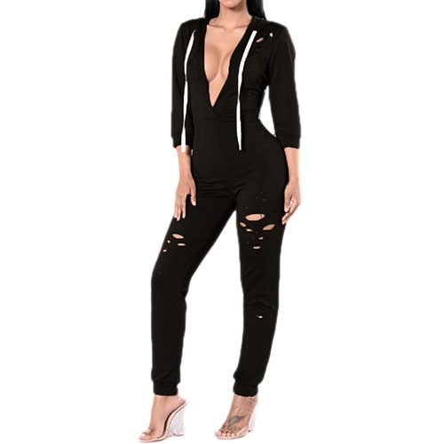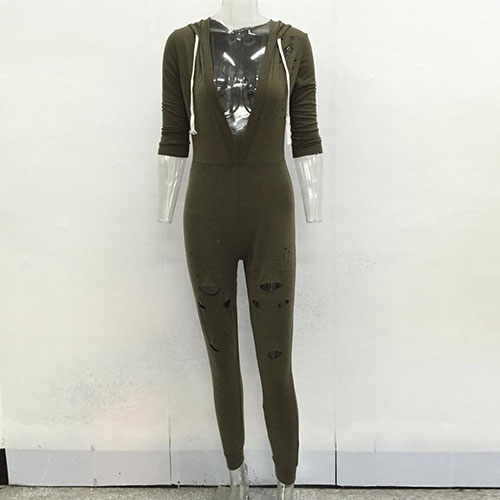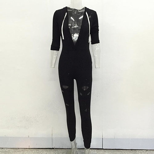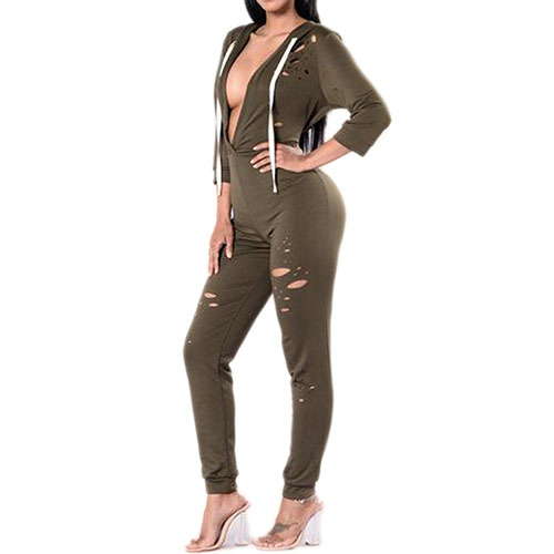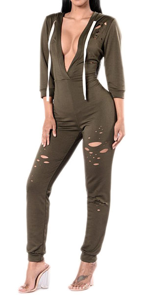 Designed with solid color, deep v-neck and hooded, this jumpsuit would better strengthen your all advantages.