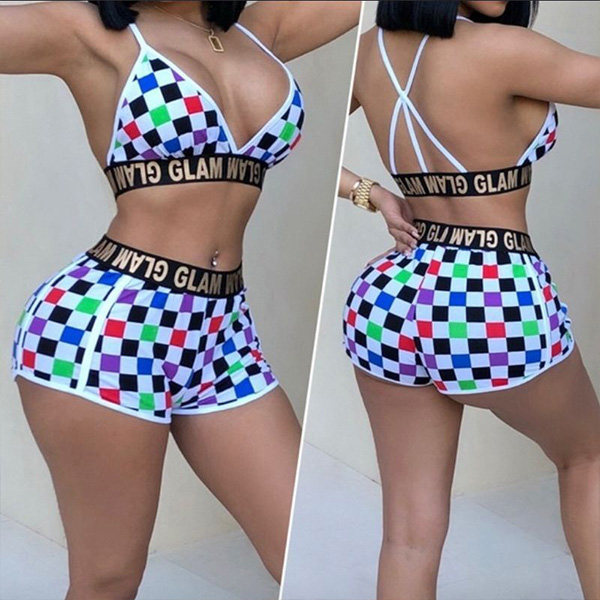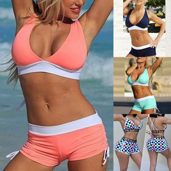 a halter bra and a swimsuit shorts,this bikini set is sure to give you a happy beach day.