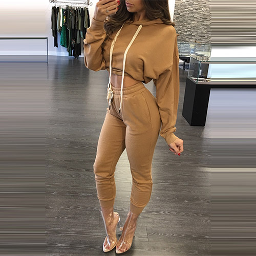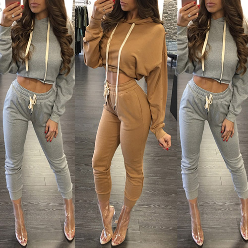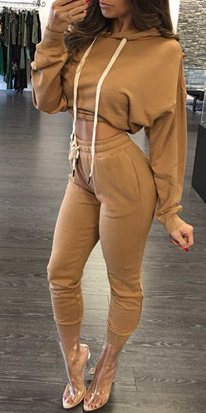 including hooded long sleeve crop tops and drawstring waist pants, this set shows its casual style
