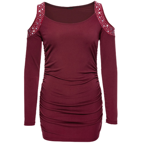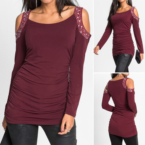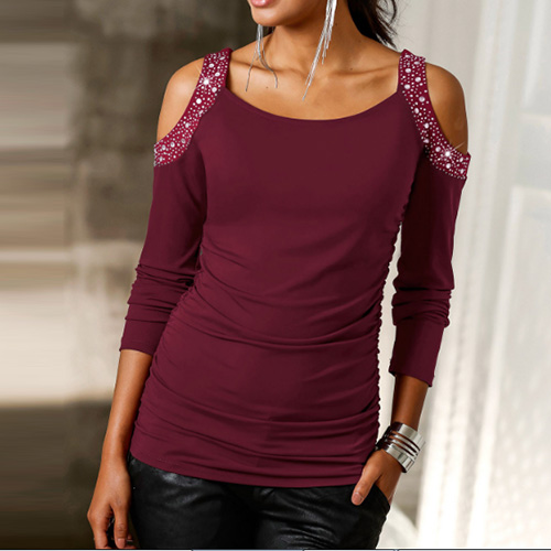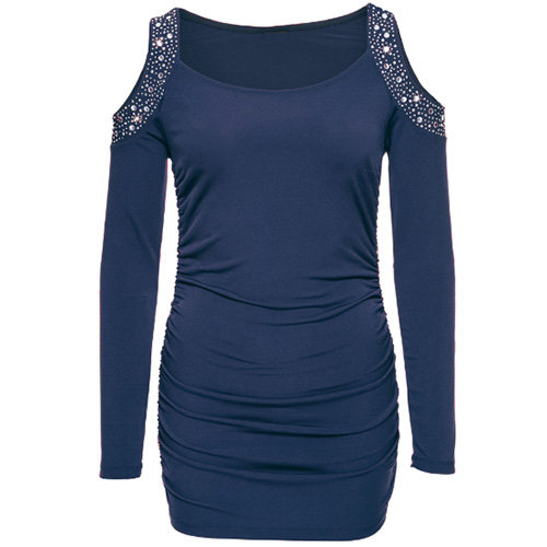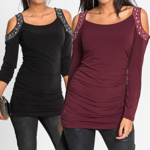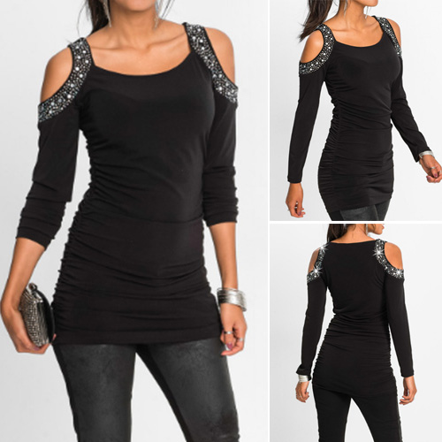 delicate hot fix rhinestone technology, accompanied with round neck, long sleeve and cold shoulder