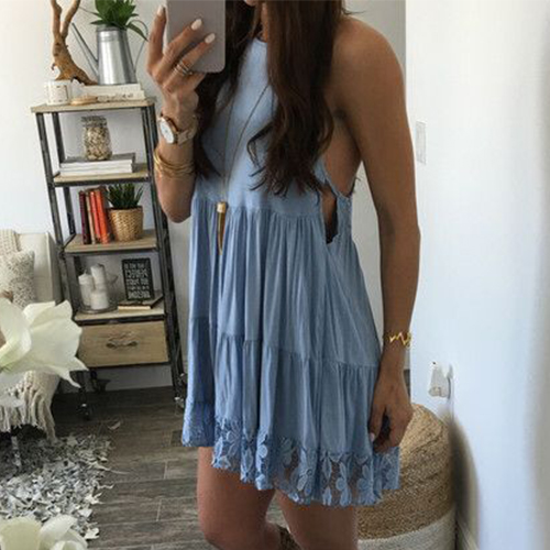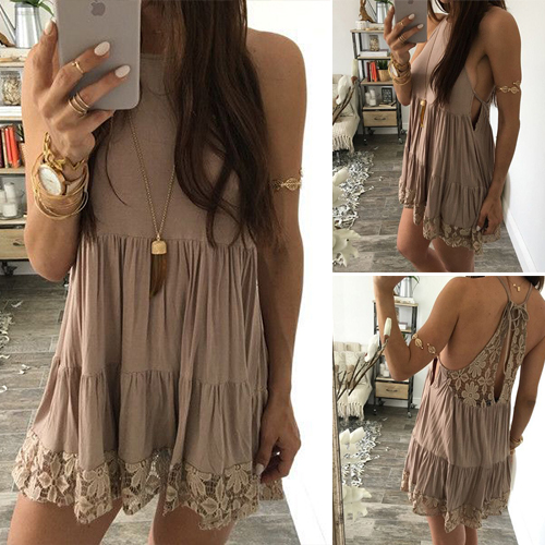 with lace spliced, sleeveless and crinkle hemline design, this dress can give you a sexy and charming look.