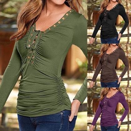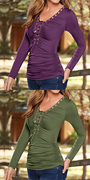 There is no doubt that this solid-coloured tops would be an assurance of your femininity. Its v-neck,