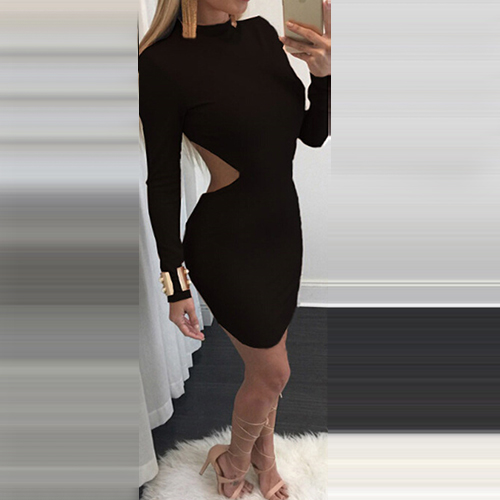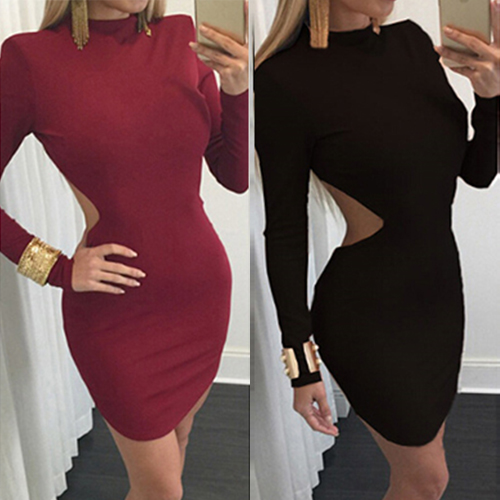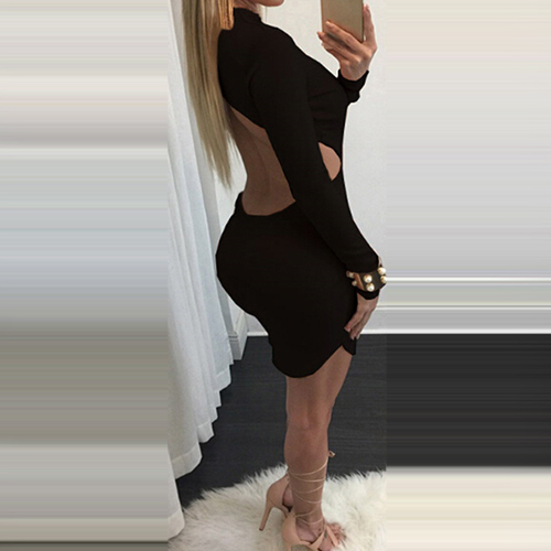 charming figure. It features solid color, mock neck, long sleeve and backless design