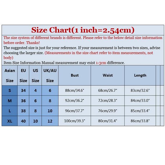 XL : Bust : 100cm(39.37"); Waist : 80cm(31.5"); Length : 86cm(33.86");